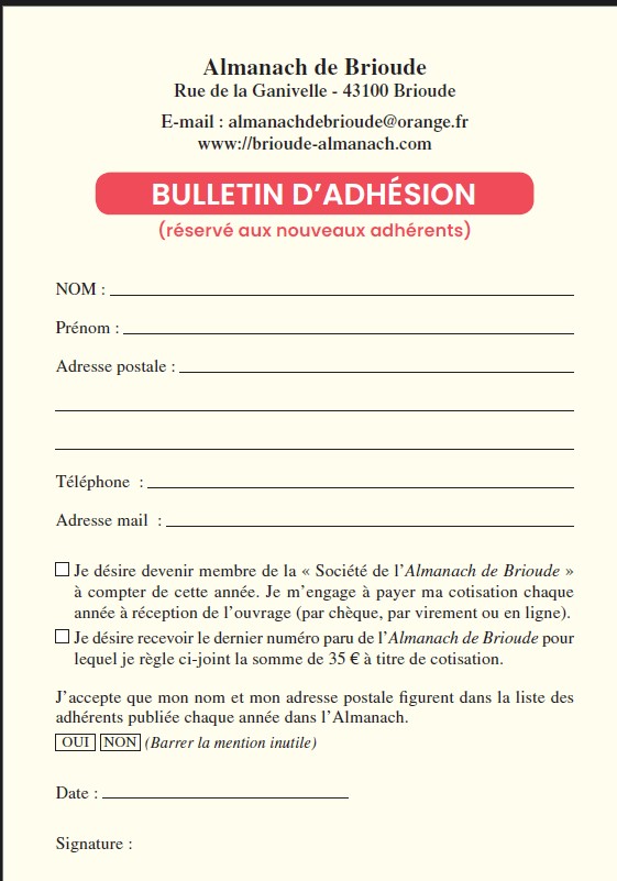 | L’adhésion entraîne l’envoi du bulletin annuel. Le paiement de la cotisation annuelle s’effectue à réception de cet ouvrage (35 euros +8 euros frais envoi) |